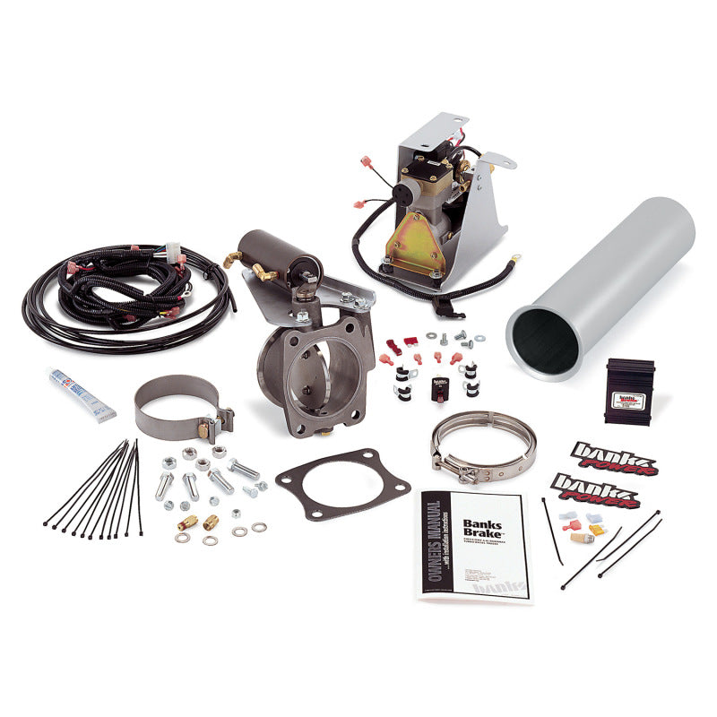 Computer-controlled exhaust brake safely cuts downhill speeds up to 52% without use of wheel brakes. It's better because it's Banks. Banks Brake is designed and tested by engineers to provide strong, safe and sustained braking power. If your truck hauls loads and navigates hills, don't settle for less. Some designs bypass so much exhaust flow that they provide little or no additional braking. Others restrict exhaust flow when not in use, impeding driving performance. With its large housing and intelligently designed butterfly valve, Banks Brake provides superior braking power and allows for better engine breathing when not in use. One smooth operator. Banks' computerized brake control automatically senses throttle position, controls brake engagement and provides smooth operation. None of that jolty, jerky feeling or annoying brake noise. Automated brake disengagement at low speed smoothes stop-and-go driving, improves mileage and helps eliminate turbo lag. Cuts downhill speeds in half. Downhill speeds are cut in half without use of the wheel brakes. This keeps them cool and ready for emergencies. Pays for itself. Banks Brake can actually pay for itself in reduced brake wear and brake maintenance while providing an extra margin of safety and peace of mind. Best of all, it's maintenance free.; Fitment Notes:; For Auto Trans.; Compressor relocation kit required when used w/Ram-Air #55234; Flange Adapter kit required when installing on non-Banks exh #55246